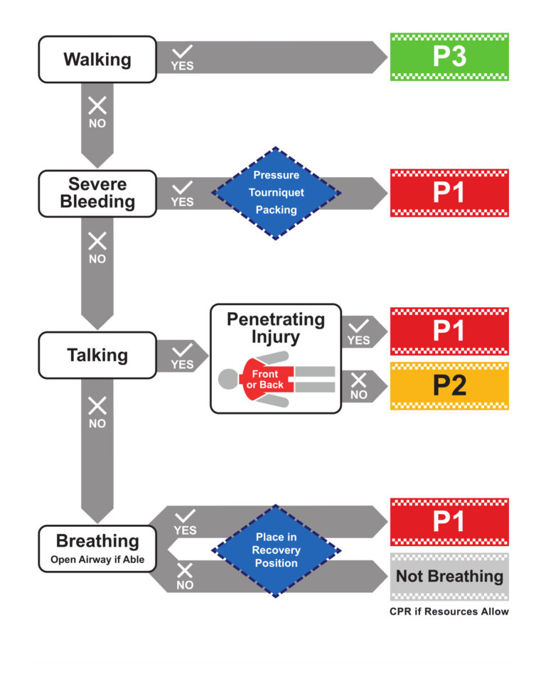 Instead of the Primary Survey the initial actions will be to perform triage using an appropriate tool. The standard tool for first responders is now “Ten Second Triage” (TST). This separates casualties into P1, P2, P3, and “Not Breathing” – where P1 is the highest priority casualties. A responder will perform an initial triage, attach triage bands to each casualty’s wrist, and then move on to triage the next casualty. A very small number of Live Saving Interventions (LSIs) may be performed as directed by the TST process, only.